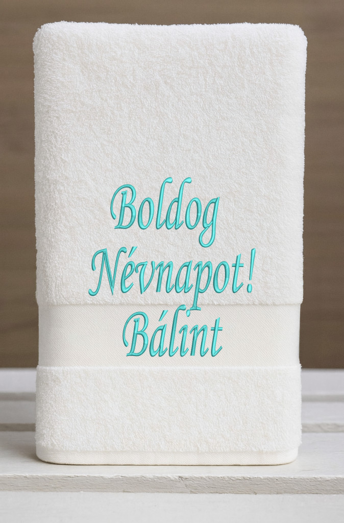 Egyedi hímzett törölköző – Boldog Névnapot!/Fehér türkiz