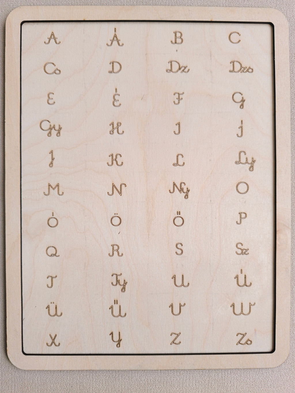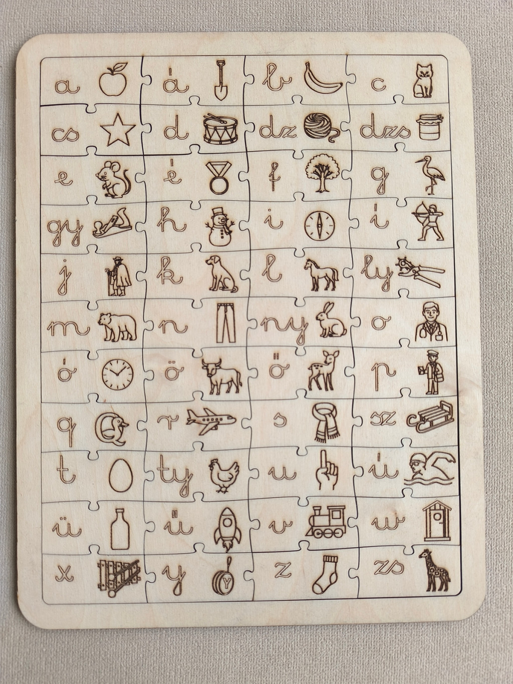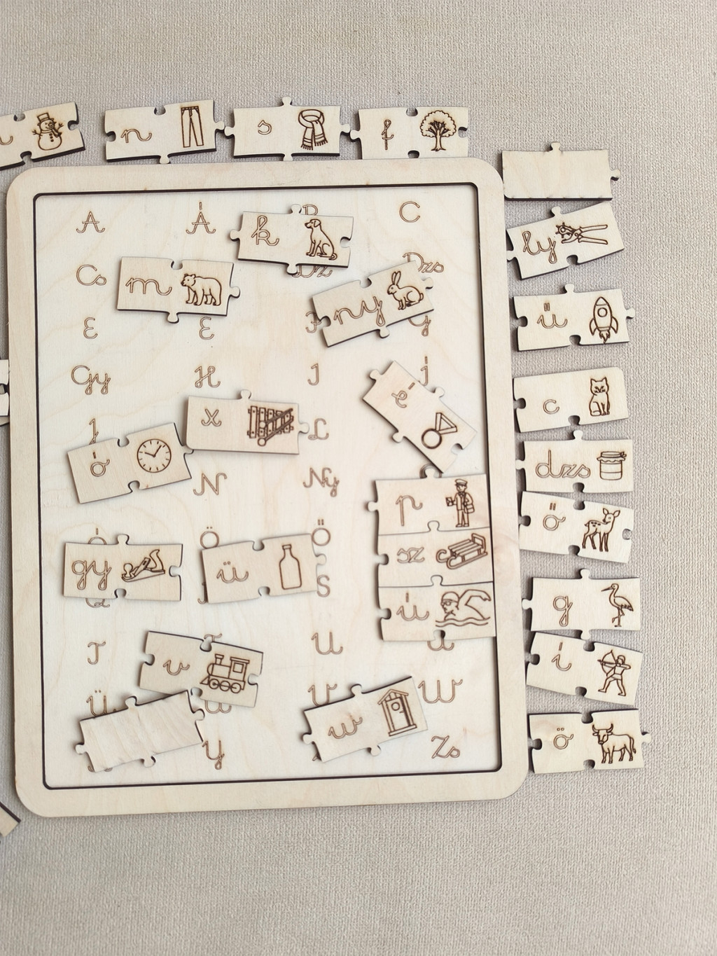 Ez egy fa betűpárosító puzzle, amely a teljes magyar ábécét tartalmazza kis és nagy betűkkel.