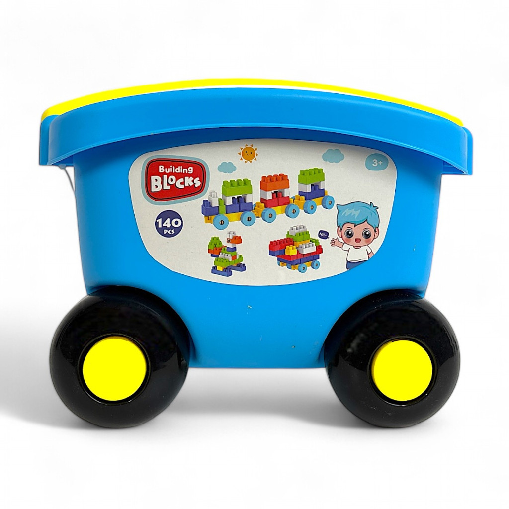 Építőkocka klt., + húzós kocsi, 140 db, 28x21 cm
