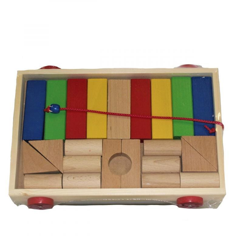 Fa építő készlet húzós kiskocsiban, színes és natúr építőkockákkal, 23x32 cm fóliás csomagolásban